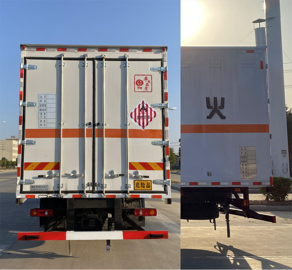 | 配置 | 1、該車適用于運輸危險品,運輸具有**容器(瓶)包裝的物品,運送危險物品類項號:4.1,4.2,4.3。廂體頂部封閉,不可開啟。2、側/后防護材料為Q235,螺栓連接,截面尺寸(mm)120×60,下邊緣離地高490mm。選裝不帶尾板。后防護材料為Q235,焊接,截面尺寸(mm)120×60,下邊緣離地高490mm。3、僅采用軸距(mm):4700,5000。隨底盤選裝駕駛室前面罩,選裝側窗玻璃,駕駛室頂部中間三個裝飾燈為選裝件,前霧燈為選裝件;駕駛室前臉擾流罩為選裝件。僅選用排氣管前置、限速裝置(限速80km/h)、前輪盤式制動及子午線輪胎的底盤。轉向輪安裝輪胎爆胎應急防護裝置。后軸采用空氣懸架。安裝帶有衛星定位功能的行駛記錄儀;EBS型號/生產廠家:EBS5/東科克諾爾商用車制動系統(十堰)有限公司。采用的發動機與油耗值(L/100Km)對應關系為: B6.2NS6B210/26.5,DDi50E190-60/23.9。廂體尾部安裝尾板,尾板收起狀態水平長度為290mm,尾板質量為550kg。選裝ETC。 | ||