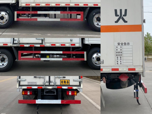 其它 | 1、該車(chē)為危險(xiǎn)品運(yùn)輸車(chē).運(yùn)輸具有獨(dú)立容器(瓶)包裝的易燃液體物品.運(yùn)送危險(xiǎn)物品類(lèi)項(xiàng)號(hào):3類(lèi).廂體頂部封閉不可開(kāi)啟.2、側(cè),后防護(hù)材料均為Q235,側(cè)防護(hù)螺栓連接,后防護(hù)焊接,截面尺寸(mm):100×50,下邊緣離地高430mm.3、整備質(zhì)量含備胎,滅火器及隨車(chē)工具;貨廂重量為1090kg;材質(zhì)/厚度:復(fù)合板結(jié)構(gòu)廂體:底板材質(zhì)為Q235,厚度3mm,側(cè)板為外Q235+中間阻燃泡沫+內(nèi)純鋁板,厚度42mm;瓦楞板結(jié)構(gòu)廂體:底板材質(zhì)為Q235,厚度3mm,側(cè)板為Q235,厚度1.5mm.4、僅選用排氣管前置、限速裝置(限速80km/h)、前輪盤(pán)式制動(dòng)及子午線輪胎的底盤(pán),轉(zhuǎn)向輪安裝輪胎爆胎應(yīng)急防護(hù)裝置,安裝具有衛(wèi)星定位功能的行駛記錄儀.ABS系統(tǒng)控制器型號(hào)/生產(chǎn)企業(yè): APG3550500A/浙江亞太機(jī)電股份有限公司,3550B500/浙江亞太機(jī)電股份有限公司,VIE ABS-II/浙江萬(wàn)安科技股份有限公司.發(fā)動(dòng)機(jī)/油耗值(L/100km)對(duì)應(yīng)關(guān)系為:JX493ZLQ6D/10.75,JX4D25A6H/10.83.隨底盤(pán)選裝駕駛室,選裝白色中網(wǎng),選裝白色前保,選裝黑色前保,選裝廂體側(cè)面選裝開(kāi)門(mén)型式及位置,選裝不帶側(cè)開(kāi)門(mén),選裝貨廂平面或瓦楞結(jié)構(gòu);廂體側(cè)面選裝開(kāi)百葉窗,選裝后部樣式,該車(chē)可選裝直接供電式ETC車(chē)載裝置. | ||