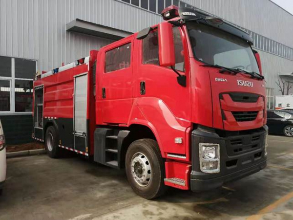 7噸消防車采用慶鈴汽車股份有限公司QL1180EQFRY 型二類汽車底盤,改制雙排駕駛室,乘員2+3人,該車駕乘舒適輕便。上裝采用內藏式水罐,整車載液量水為4650kg,泡沫為1950kg。器材箱采用高質量鋁合金卷簾門。底盤取力,發動機型號為6HK1-TCG61,最大功率177kW,通過萬向聯軸器驅動安裝在汽車尾部泵房里的上海雄真CB10/60型常壓消防泵,可在1.0MPa下穩定輸出60L/s的流量;車頂安裝成都威斯特消防器材有限責任公司生產的PL8/48型消防炮(泡沫消防車),流量48L/s,對應壓力0.8MPa,最大承壓1.3MPa,射程 水≥70m 泡沫≥60m,可360°旋轉。同時該車具有比功率大、綜合性能強、操控集中簡便等特點。